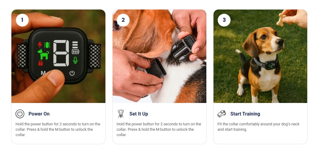 Corrective Feedback – The collar delivers gentle vibration, beep sound, or static stimulation based on your selected mode.
